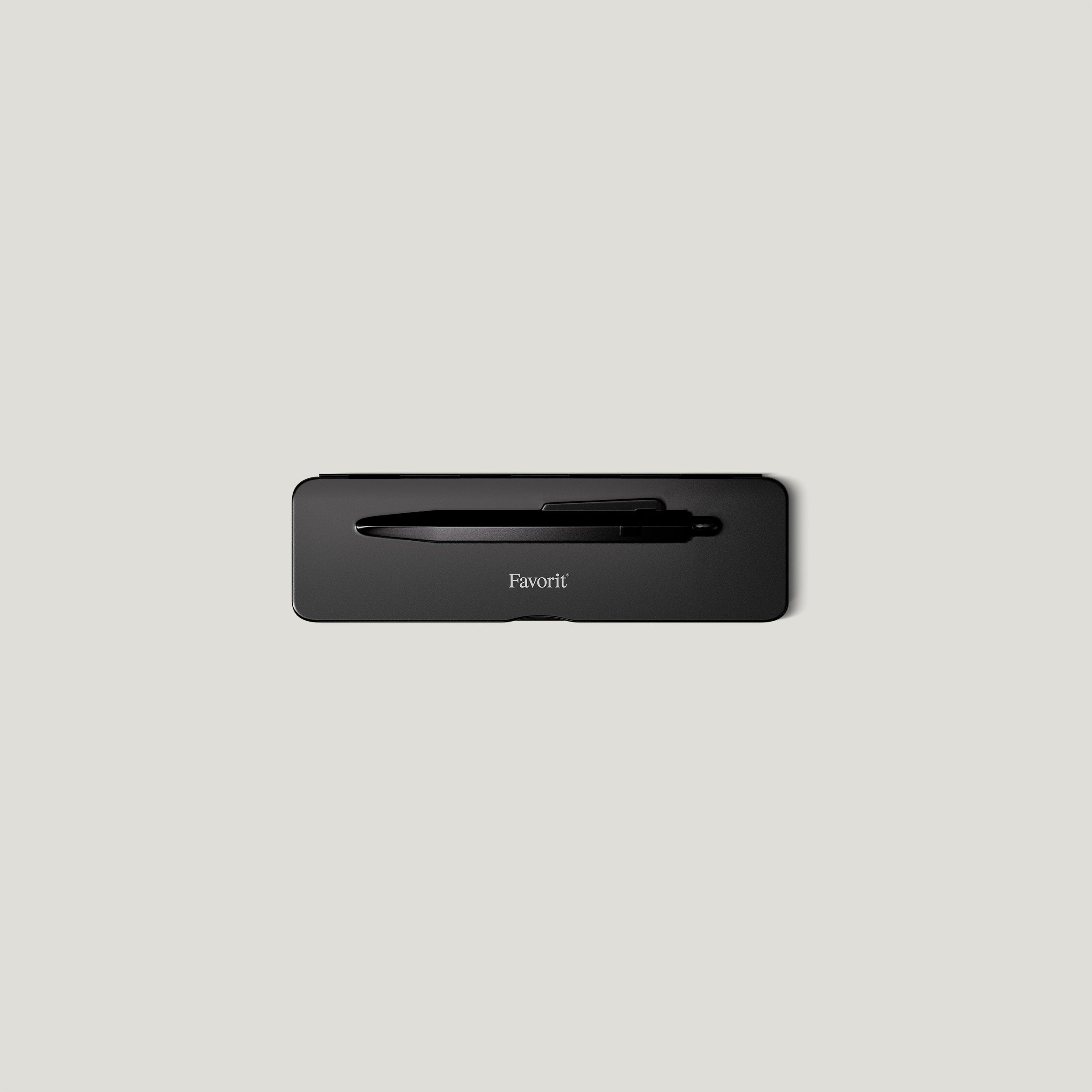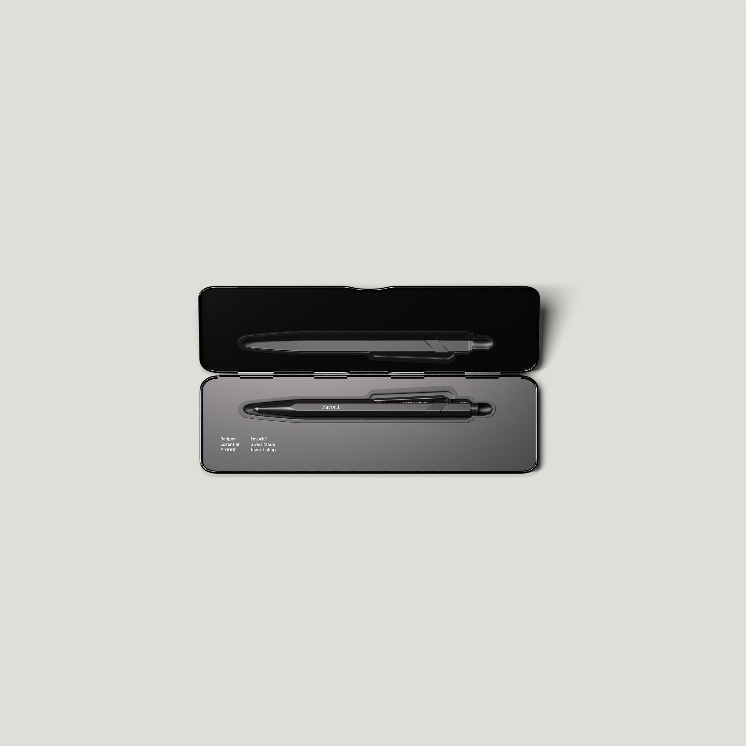 Ein Favorit Essential. Metall-Kugelschreiber in Mattschwarz, ausgestattet mit einer austauschbaren, schwarzen Medium-Mine. Geschützt im schwarzen Slimpack mit weissem Druck. Gemacht für den täglichen Gebrauch. Langlebig und präzise. Für Notizen, Entwürfe und Entscheidungen. Seit 1915 steht Caran d’Ache für Schweizer Schreibkultur, Präzision, Materialqualität und langlebige Mechanik. Jeder Stift wird in Genf gefertigt, mit derselben Sorgfalt, die unsere Essentials prägt.